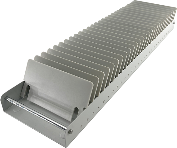 In einem Auszug haben 5 Einsätze nebeneinander platz und bieten den optimalen Stauraum für 135 CD’s.